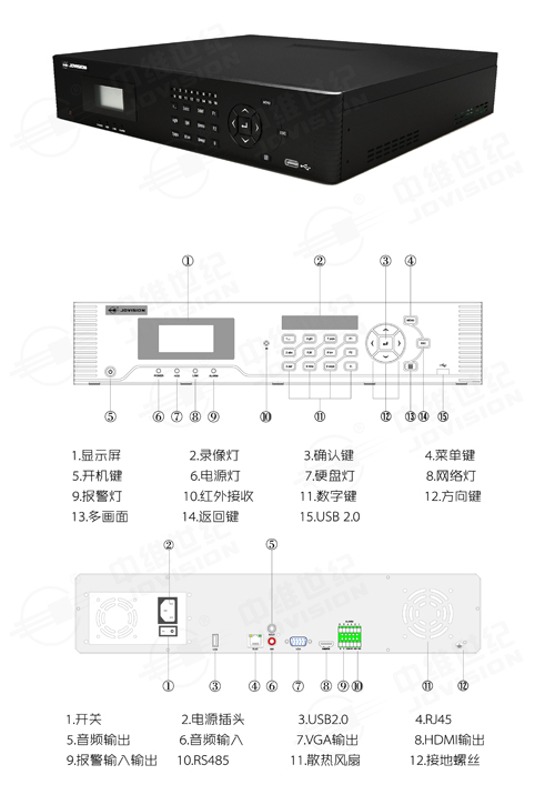 中维JVS-ND8000-H1系列是公司最新研发推出的一款网络高清录像机,采用标准的H.264压缩算法、嵌入式Linux实时操作系统,实现对 IPC的集中管理、集中预览、集中录像、录像回放、设备管理、远程设置IPC、区域遮挡、外接报警设备等多种实用功能。该产品既可以进行本地独立工作,也 可联网组成一个强大的安全防范监控系统。中维JVS-ND8000-H1系列的NVR产品可广泛的应用于金融、公安、部队、电信、交通、电力、教育、水利 等领域的安全防范。