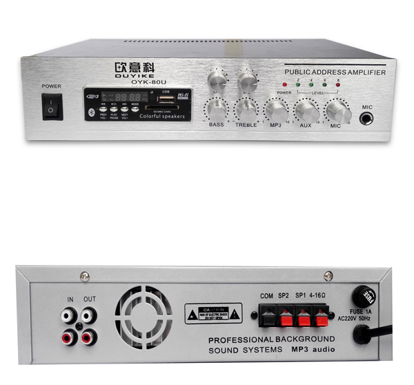 采用高档铝合金拉丝面板,带有可靠的短路保护、一路话筒输入,并具有默音功能,话筒、线路、MP3、高低音均可独立调节。可插U盘支持MP3文件播放,内置FM收音机,蓝牙功能。两路分区可独立调节音量,内置扇热器风扇,率输出:80W