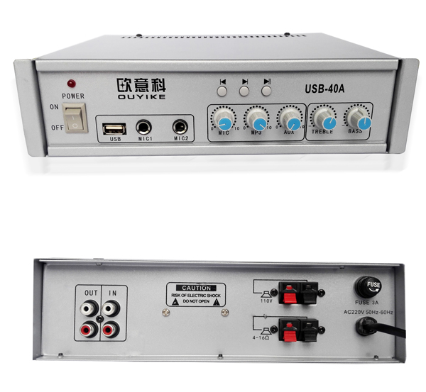 功率输出:4-16Ω/100V定阻,定压形式。两路话筒(其中一路有优先默音功能),一路线路输人。一路线路输入可接CD.调谐器等。一路线路输出可做录音或供其它功放做音源使用。话筒,线路,MP3.高低音均可独立调节。为方便用户使用,该产品还带U盘解码功能,支持MP3.WMA两种格式。