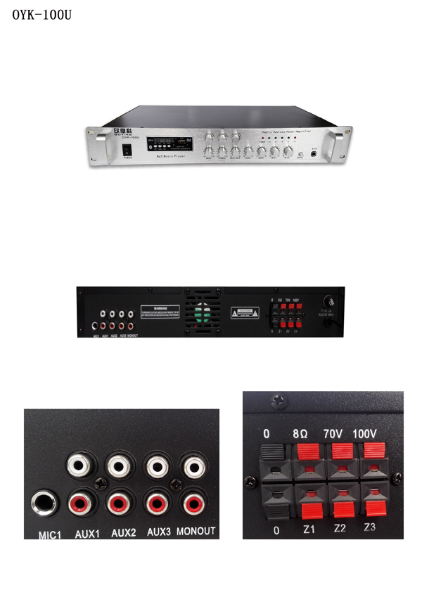 三路话筒输入,三路线路输入,一路线路输出,其中一路话筒有默认优先功能,有高低音调节功能,3分区独立音量调控输出,本产品带有USB接口/SD卡槽/FM,支持MP3格式。便于紧急广播,功率输出短路保护警告、自带提示音报警。