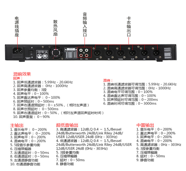 6. 混响时间可调范围:0~3000ms