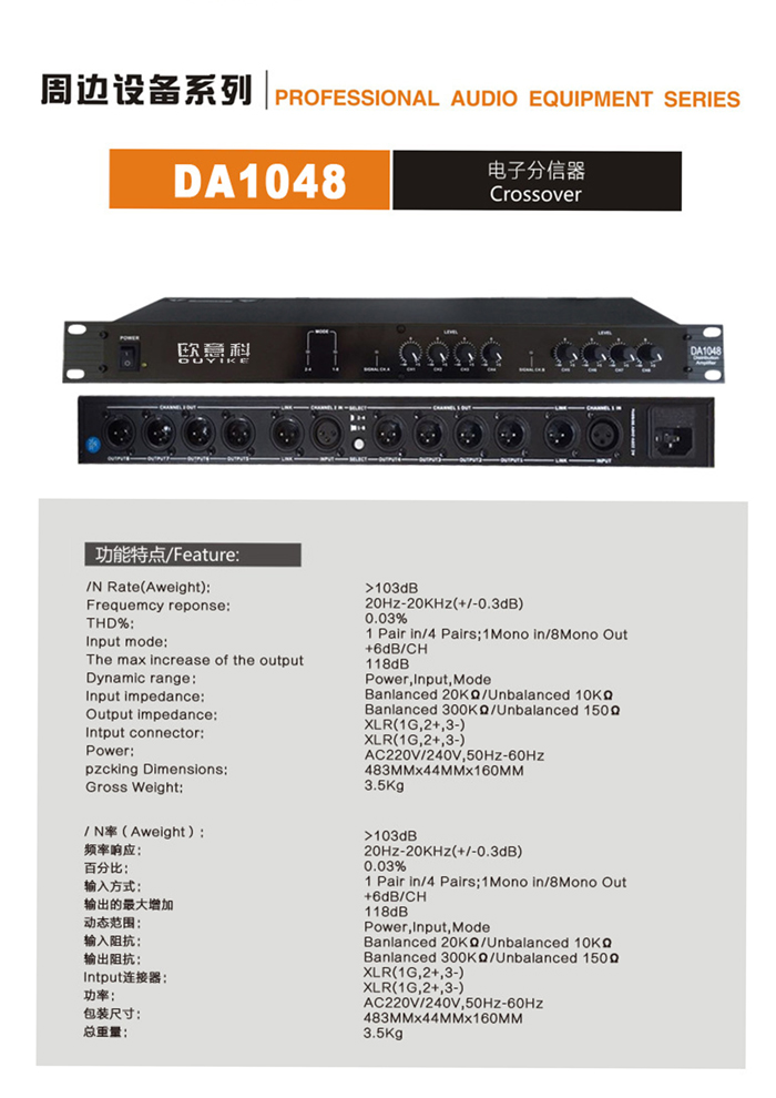 DA1048立体声输入时,各有5路分支输出,能单独调节电平。单声道输入时,有10路分支输出,能单独调节电平。