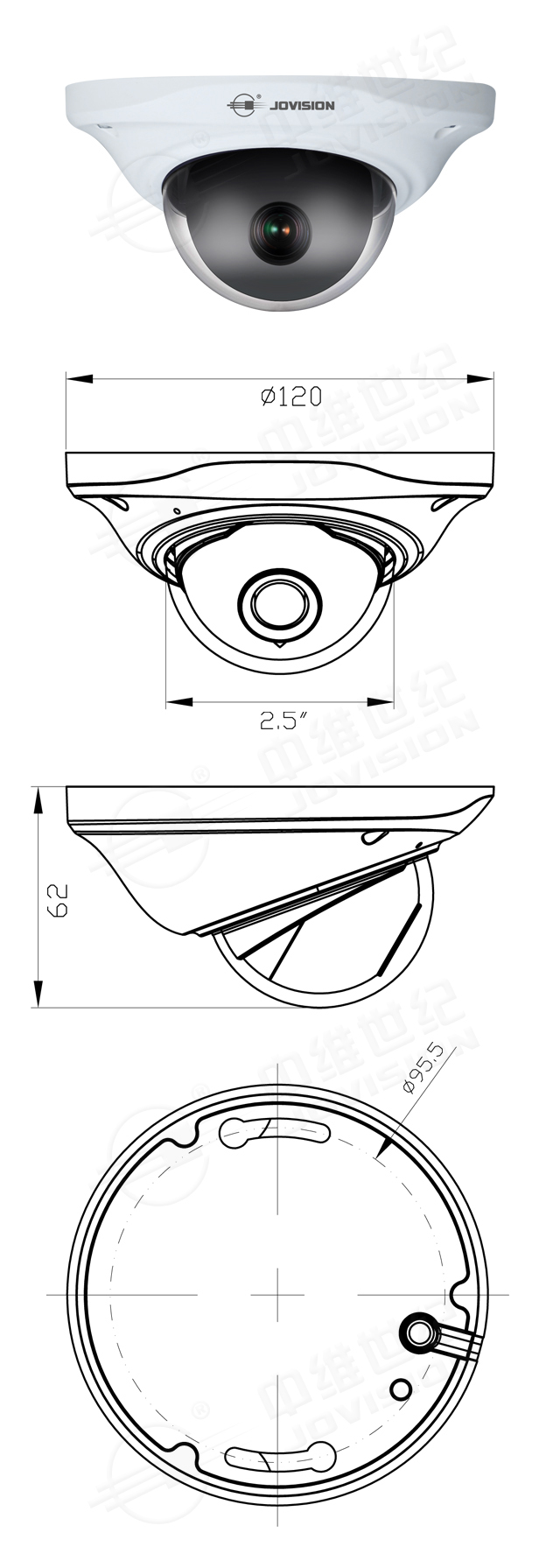 外观呈飞碟型,吸顶安装,适用于图像清晰度要求比较高、监视范围小、美观度要求高的室内电梯场所。